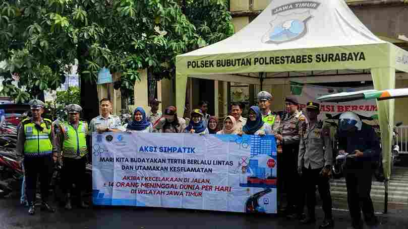 titikomapost.com, SURABAYA – PT Jasa Raharja Perwakilan Surabaya melalui Penanggung Jawab Bidang Pelayanan Denny Prayudha, Gadis Sulistyo, Norma Fetri dan Staf Samsat Surabaya Utara Almadinda Violita bersama tim Pembina Samsat Surabaya Utara yaitu Bapenda dan Polsek Bubutan menggelar aksi simpatik dengan memberikan Snack dan Souvenir berupa Gantungan kunci yang bertuliskan Pesan Keselamatan Berlalu Lintas kepada pengguna jalan yang melintas di Jl Bubutan Surabaya depan Polsek Bubutan, Selasa, (22/4/2024).