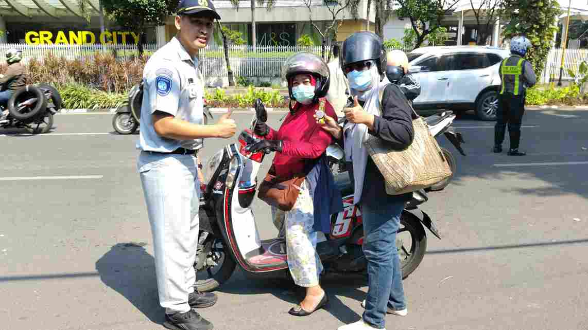 titikomapost.com, SURABAYA –  PT Jasa Raharja Perwakilan Surabaya melalui Penanggung Jawab Bidang Pelayanan Denny Prayudha dan Staf Samsat Surabaya Utara Almadinda Violita berkolaborasi bersama Unit Gakkum Polrestabes Surabaya menggelar aksi simpatik dengan memberikan Snack dan Souvenir berupa Gantungan kunci yang bertuliskan Pesan Keselamatan Berlalu Lintas kepada pengguna jalan yang melintas di Jl Raya Kaca Piring Ketabang Kec Genteng Surabaya.