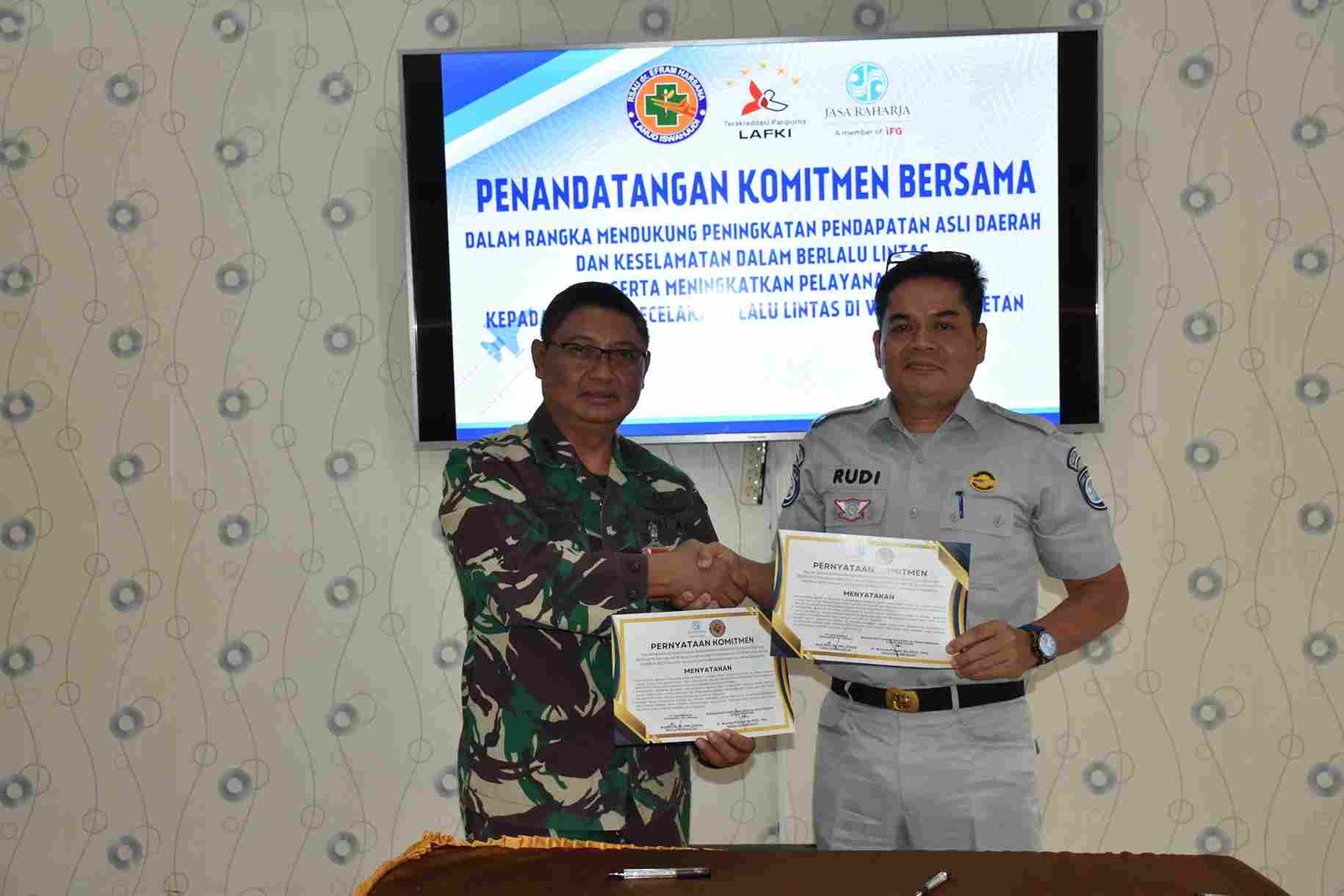 titikomapost.com, MAGETAN – Sebagai upaya mendukung pemerintah meningkatkan kepatuhan masyarakat dalam membayar pajak serta tertib berlalu lintas, Kepala PT Jasa Raharja Perwakilan Madiun Rudi Elfis SE.,MM.,CHCM melakukan penandatangan komitmen bersama dengan Kepala RSAU dr Efram Harsana Lanud Iswahjudi, dr. Wisnoe Pribadi, Sp.JP(K)., FIHA. Penandatanganan ini dilaksanakan di RSAU dr Efram Harsana Lanud Iswahjudi Magetan pada Kamis 4 Juli 2024. Kegiatan ini diinisiasi oleh PT Jasa Raharja Jawa Timur guna meningkatkan kepatuhan masyarakat dalam pembayaran PKB, Peningkatan pelayanan korban kecelakaan lalu lintas jaminan Jasa Raharja dan himbauan kepada masyarakat untuk tertib berlalu lintas.